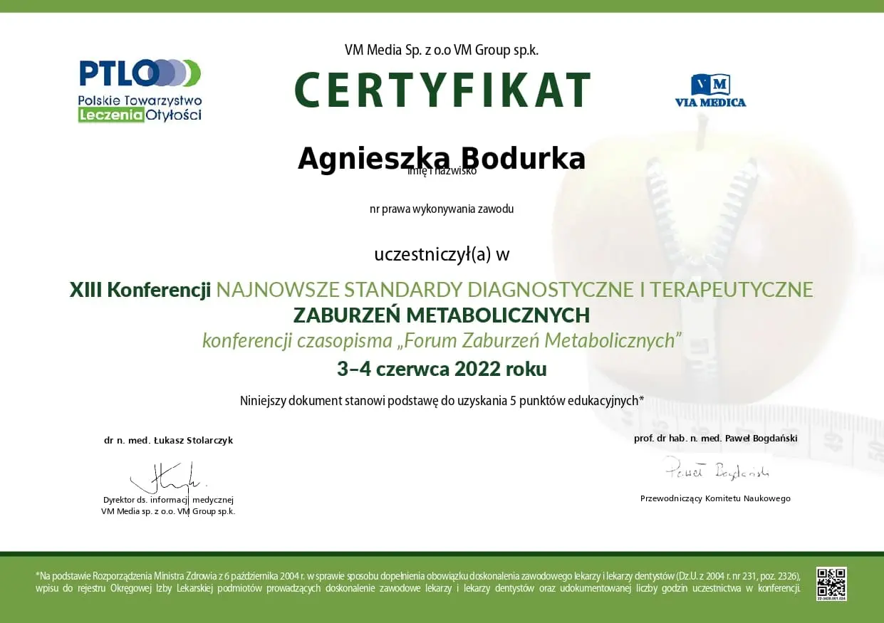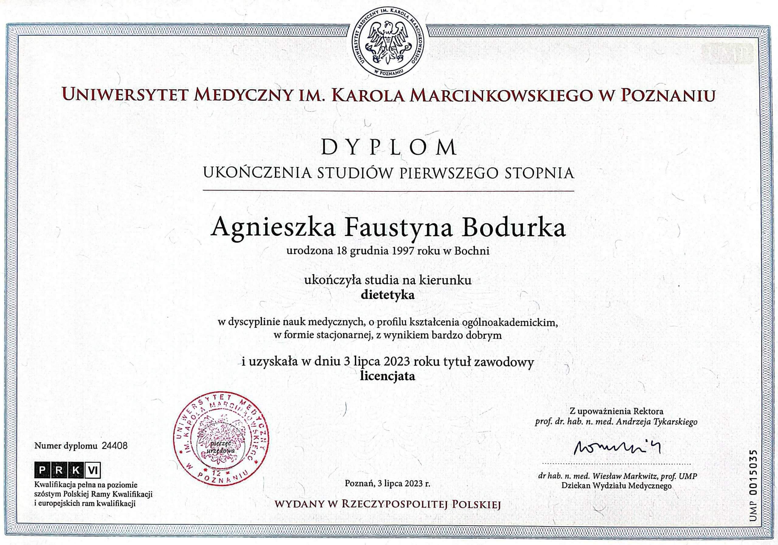 Miło mi Cię tu powitać! <3 Jestem dietetyczką kliniczną (Uniwersytet Medyczny im. Karola Marcinkowskiego w Poznaniu) i psychodietetyczką (Uniwersytet WSB Merito Gdańsk). Prowadzę konsultacje online i wykłady/warsztaty na temat odżywiania. Tworzę także jadłospisy/schematy żywieniowe. Uwielbiam pracować z ludźmi – jestem osobą ciepłą, uśmiechniętą i empatyczną. Do każdego klienta podchodzę w sposób indywidualny, biorąc pod uwagę potrzeby i oczekiwania danej osoby. Sama wiele lat zmagałam się z zaburzoną relacją z jedzeniem i własnym ciałem, co odbiło się na moim zdrowiu.